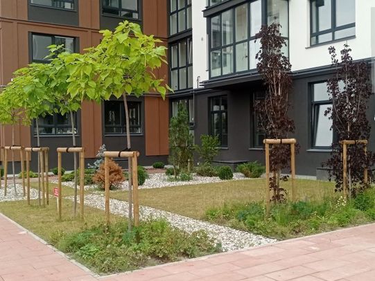 Раздельный сбор мусора. Зона выгула собак с обустроенными урнами и пакетиками. Разнообразное озеленение -более 100 сортов взрослых растений. Предусмотрена система полива растений дождевой водой, прошедшей очистку. Отдельно выделенные места для курения. Офис управляющей компании на территории квартала. Круглосуточная охрана. Коммерческие помещения, удовлетворяющие запросы комфортной жизни. Детская комната. Просторные колясочные и велосипедные с закрытом доступом на ключ-магнит. В каждом подъезде лифт опускается в подвал, в котором расположены кладовые. Так же каждый подъезд оборудован санузлом.