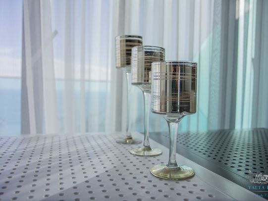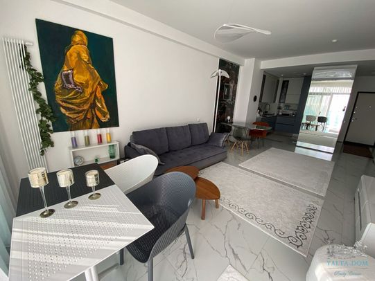 Апартамент 68 кв.м. расположен на 2-м этаже. Терраса с панорамным видом на море и Ялты. Холл, гостиная совмещена с небольшой зоной отдыха и с кухней ( есть посудомоечная машина), спальня с двуспальной кроватью, санузел с ванной совмещены.