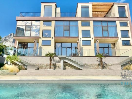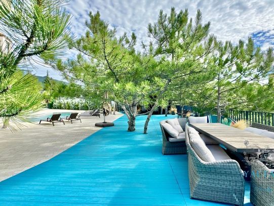 Частный таунхаус 83 кв.м. на территории 24 сотки: бассейн с подогревом, баня, эксплуатируемая крыша с видовой площадкой, садовая мебель для отдыха, панорамное остекление, большая терраса с мебелью и видом на бассейн.