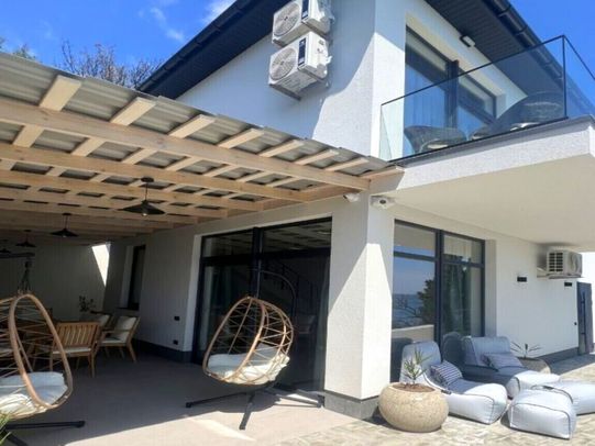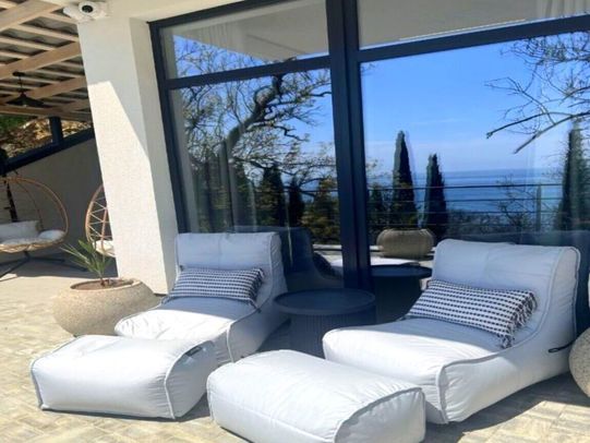На втором этаже: коридор, раскладное кресло-кровать, две изолированные спальни с выходом на балкон с летней мебелью и видом на море. На балконах - стильные стулья с удобными подушечками и стол.