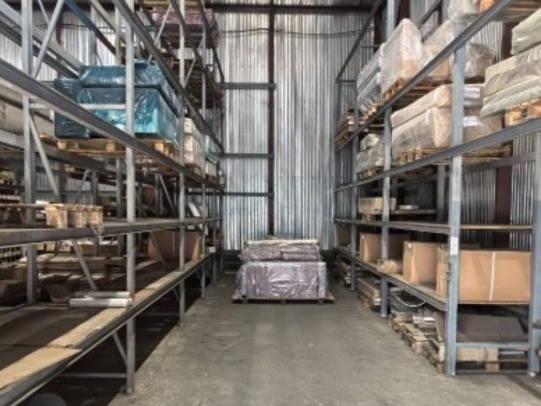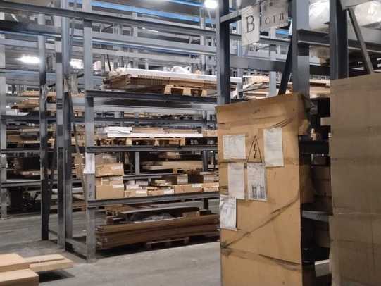 Потолки 7.5 метров. На складе установлены стеллажи.
