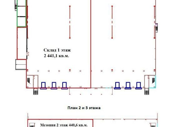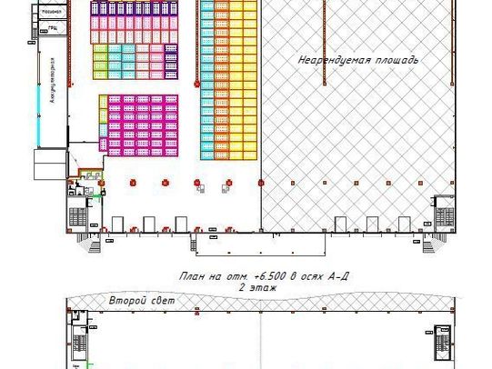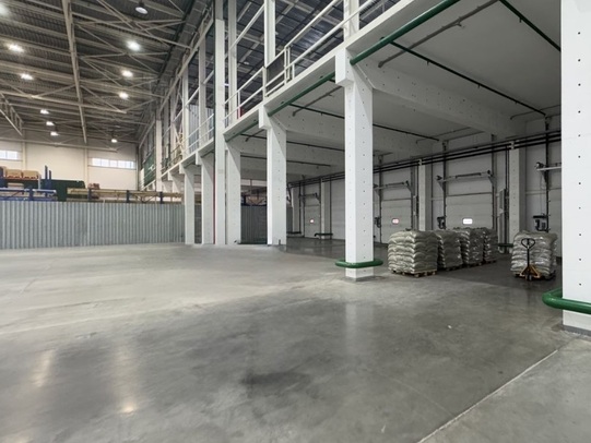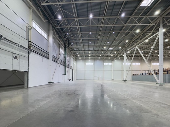 Высота потолков: 12 м. Количество ворот: 5 (1 — на нулевой отметке, 1 — с пандуса, 3 погрузочных окна доклевеллер).